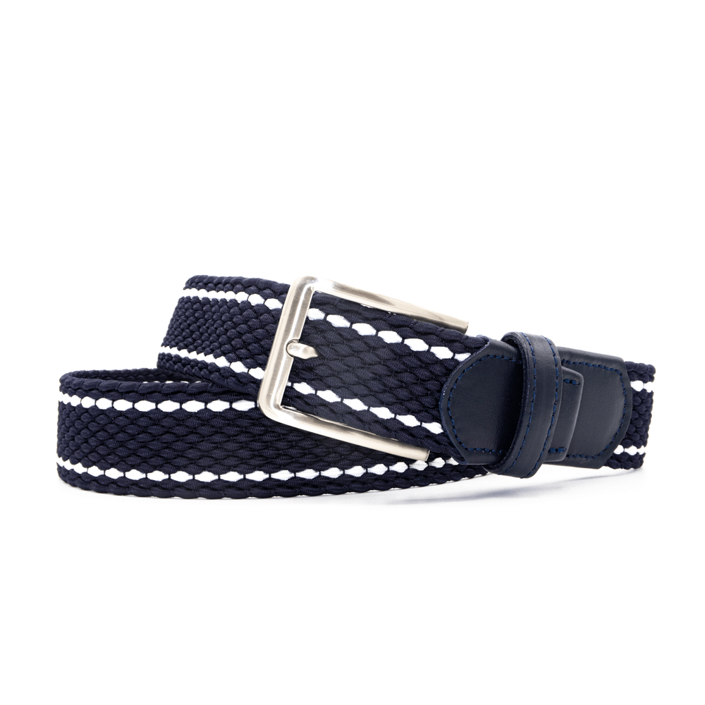 Navy and white rayon interwoven men's belt with our signature flex. Finished with a dark navy leather trim and a brushed nickel buckle. A perfect denim and jeans pairing for a casual, unique look.