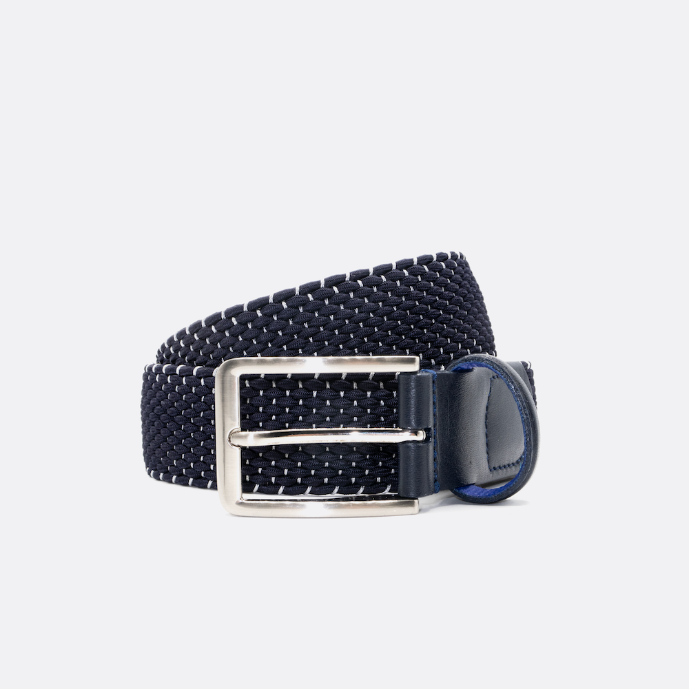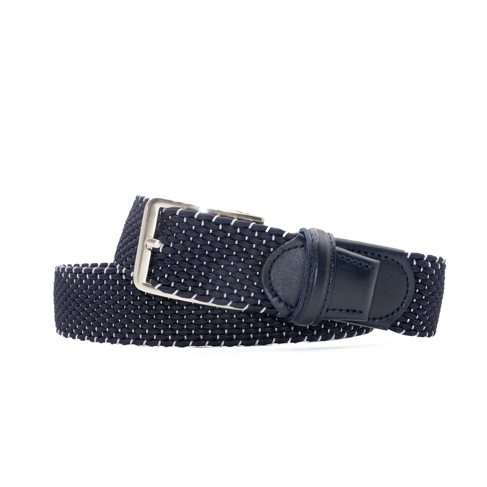 Navy and white rayon men's belt interwoven with our signature flex. Finished with a dark navy leather trim and a brushed nickel buckle. A perfect denim and jeans pairing for a casual, unique look.