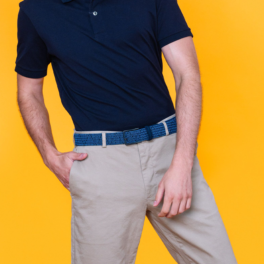Navy & blue Italian waxed cotton interwoven men's belt with our signature flex. Finished with dark navy suede trim and a custom matte black buckle.