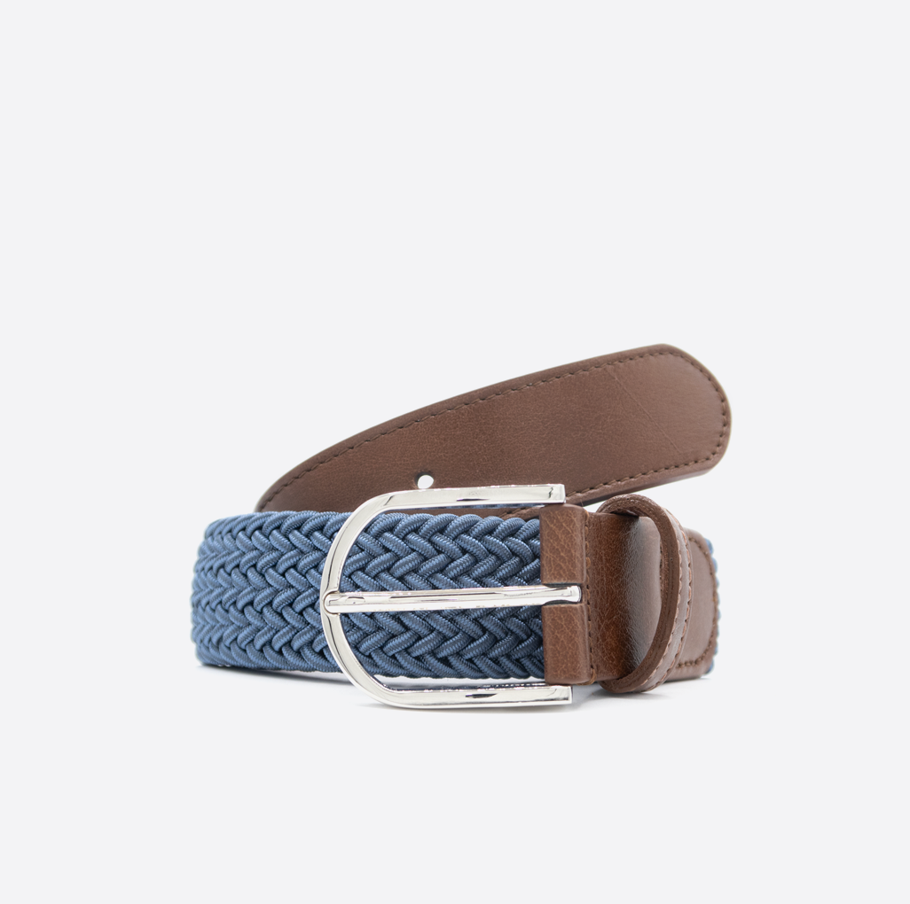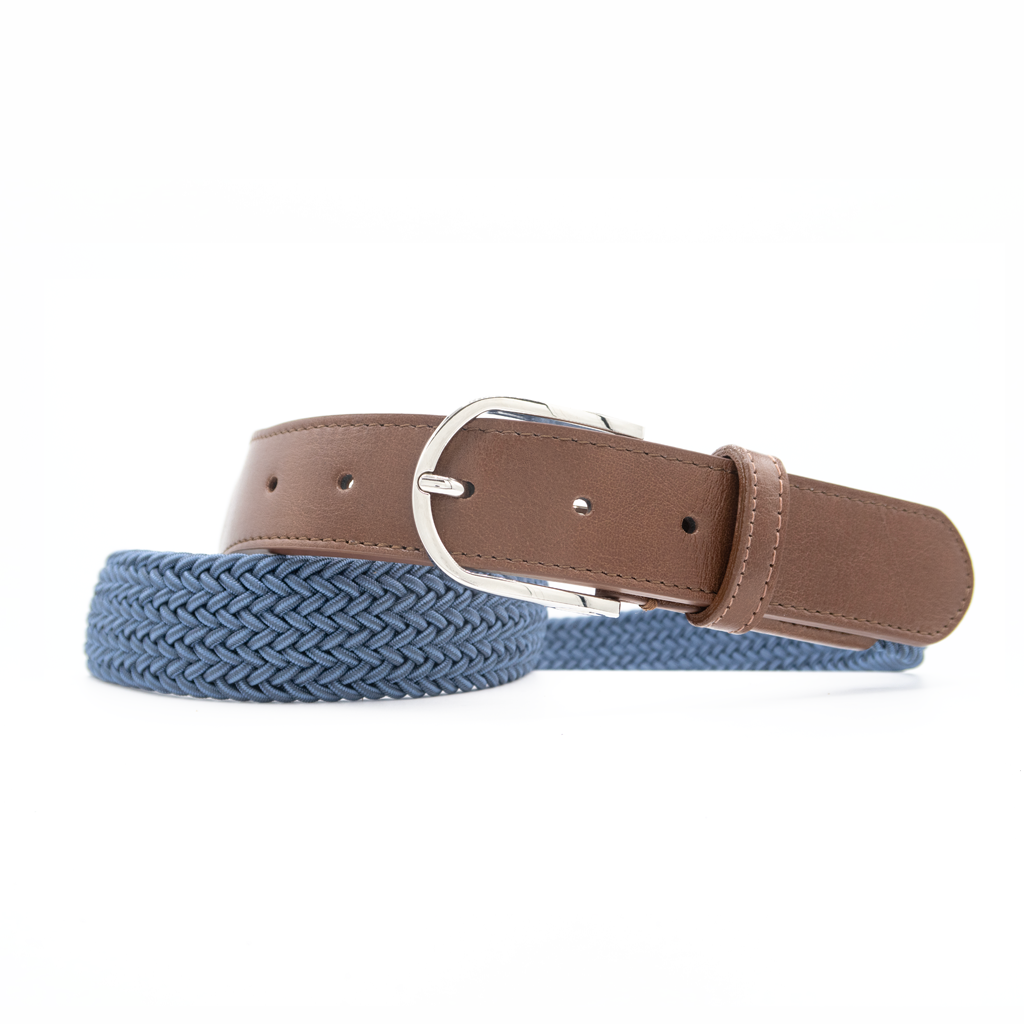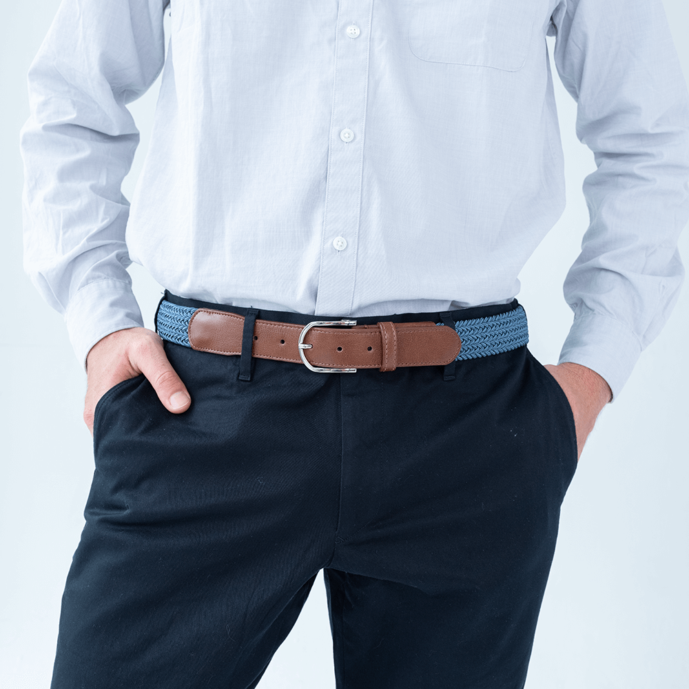The wavelength men's belt features a brown long leather tab with traditional belt holes interwoven with classy petrol and blue webbing for a traditional yet modern look.