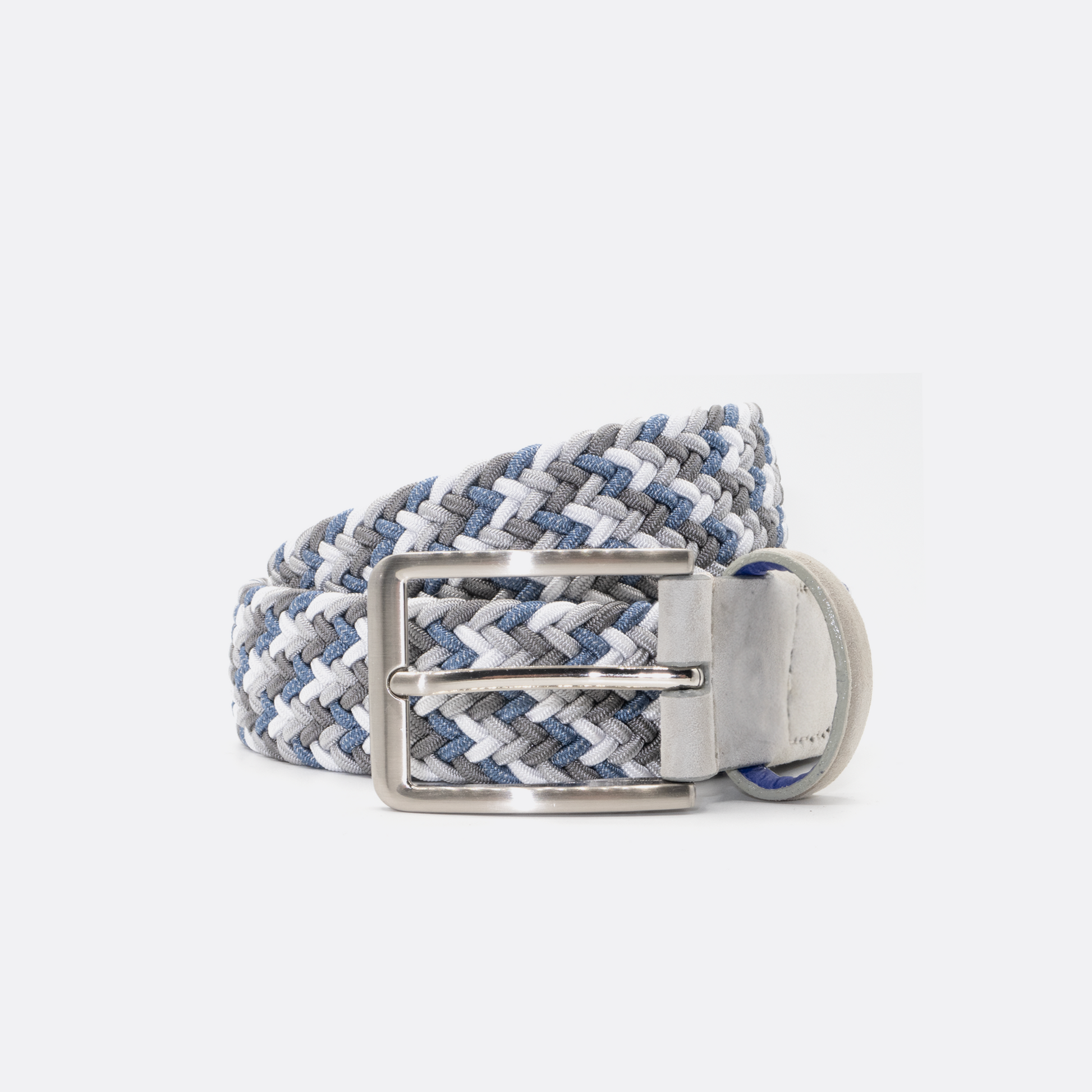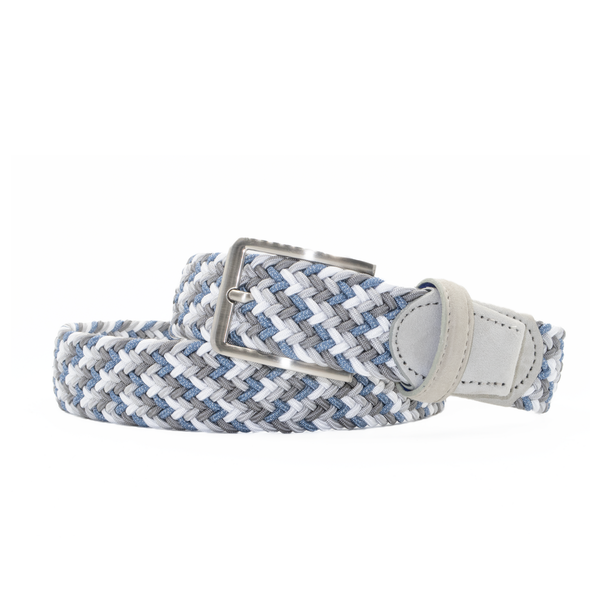 Grey, white and jeans rayon interwoven with our signature flex. Finished with a light grey suede trim and a brushed nickel buckle.