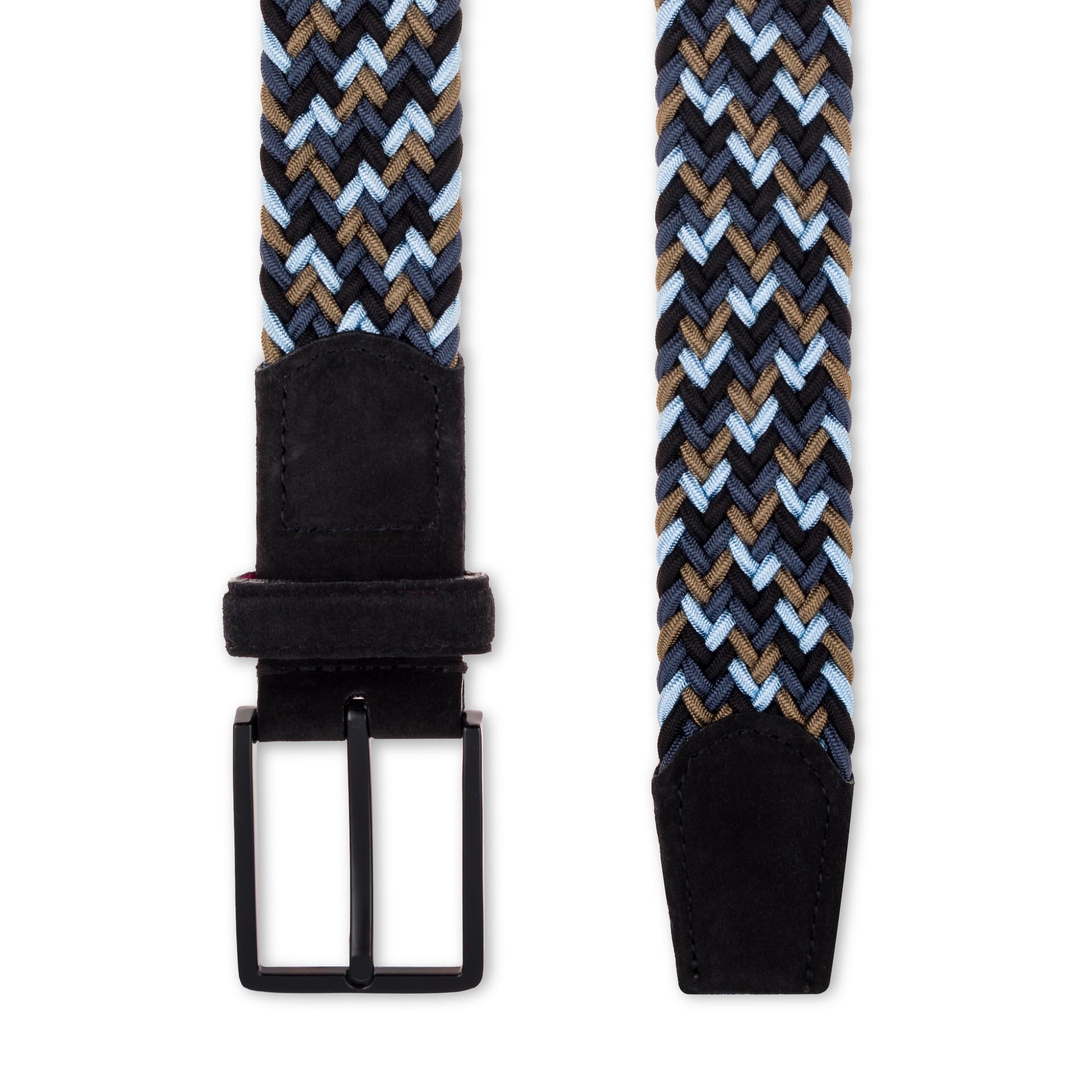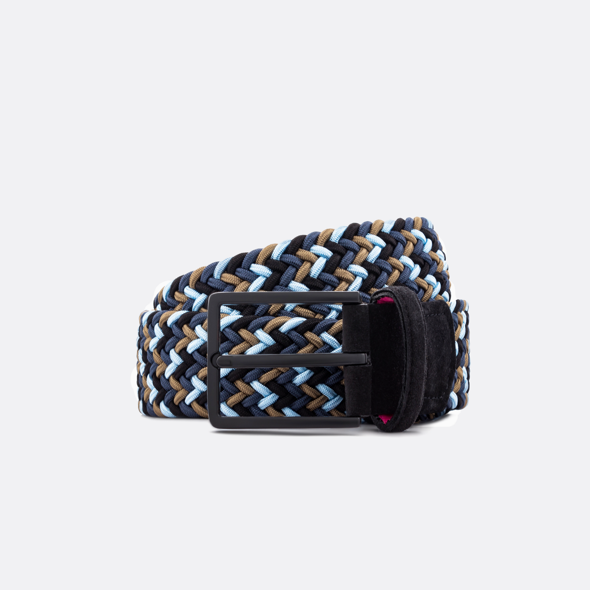 Black, light blue, petrol and beige rayon men's belt interwoven with our signature flex. Finished with a black genuine leather trim and a black matte buckle.