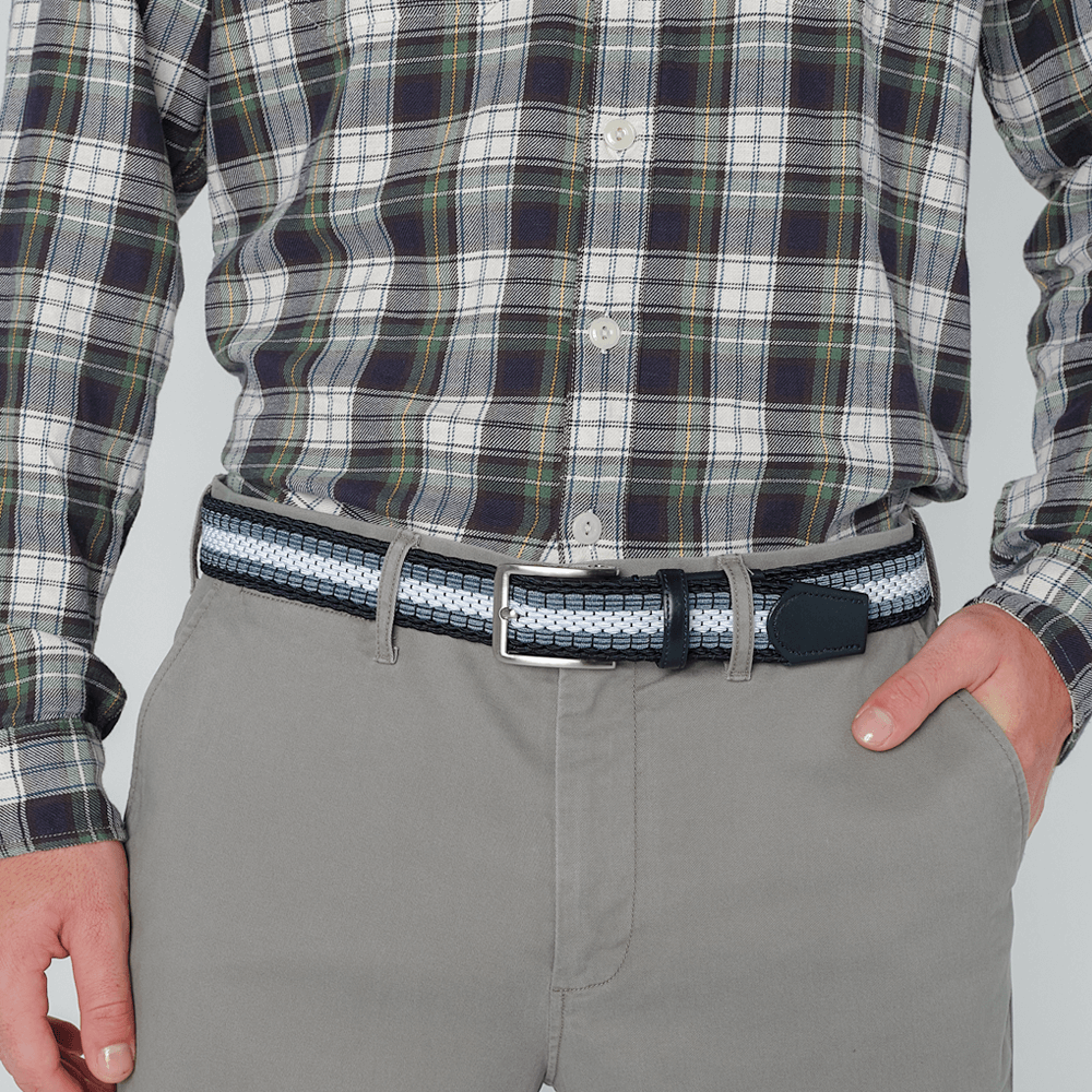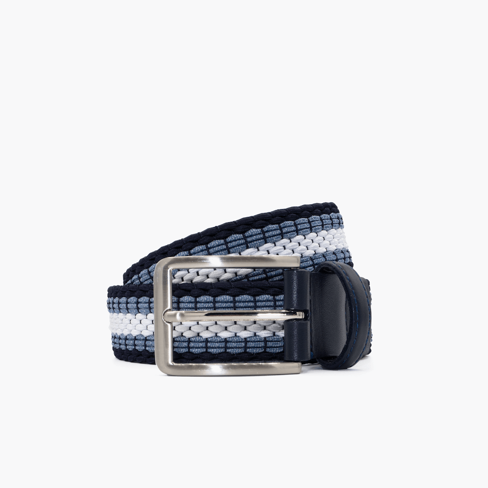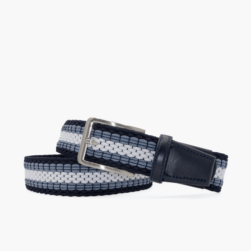 Navy, jeans and white interwoven men's belt with our signature flex. Finished with a dark navy leather trim and a brushed nickel buckle. A perfect denim and jeans pairing for a casual, unique look.