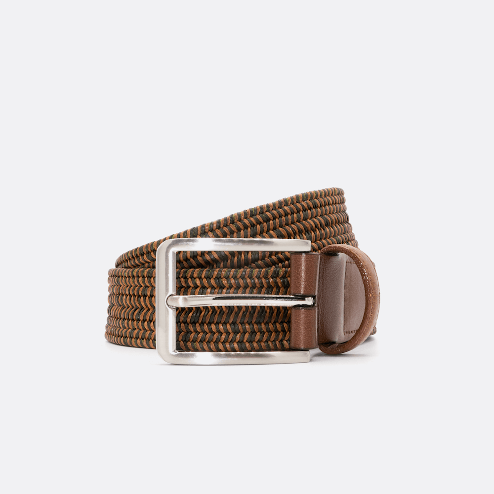 Deep green & brown Italian leather interwoven men's belt with our signature flex. Finished with brown leather trim and a custom brushed nickel buckle.